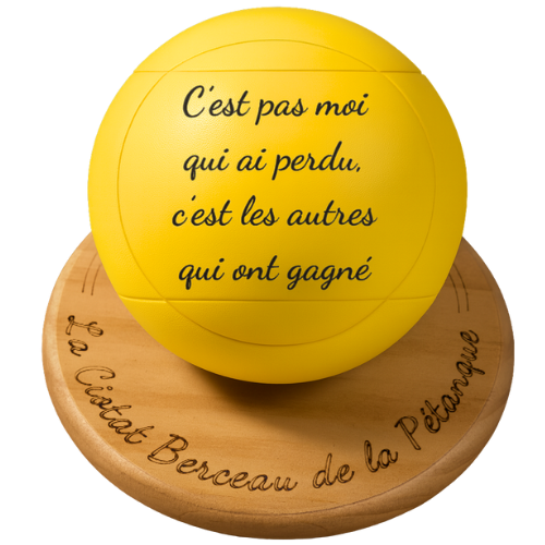 Cette phrase iconique, bien connue sur les terrains, fait sourire à chaque lecture. La gravure laser assure une finition nette et durable, tandis que la peinture disponible en plusieurs coloris (rose, jaune, bleu, blanc) permet d’adapter la boule à votre style ou à celui de la personne à qui vous l’offrez.
